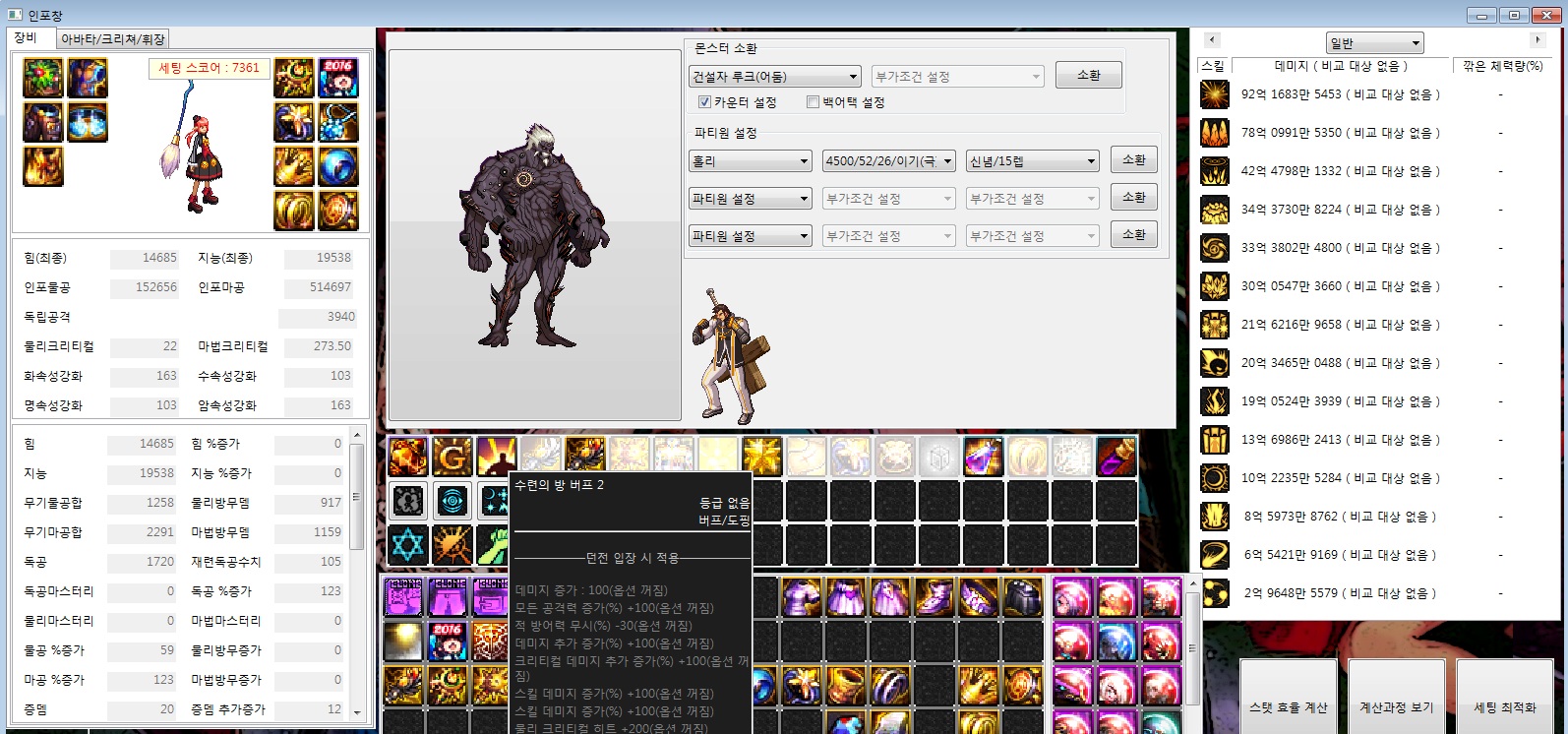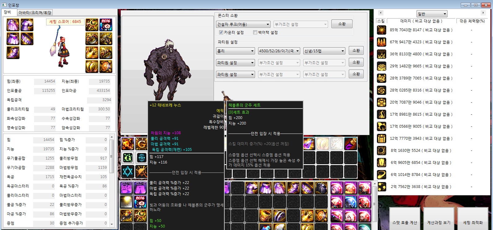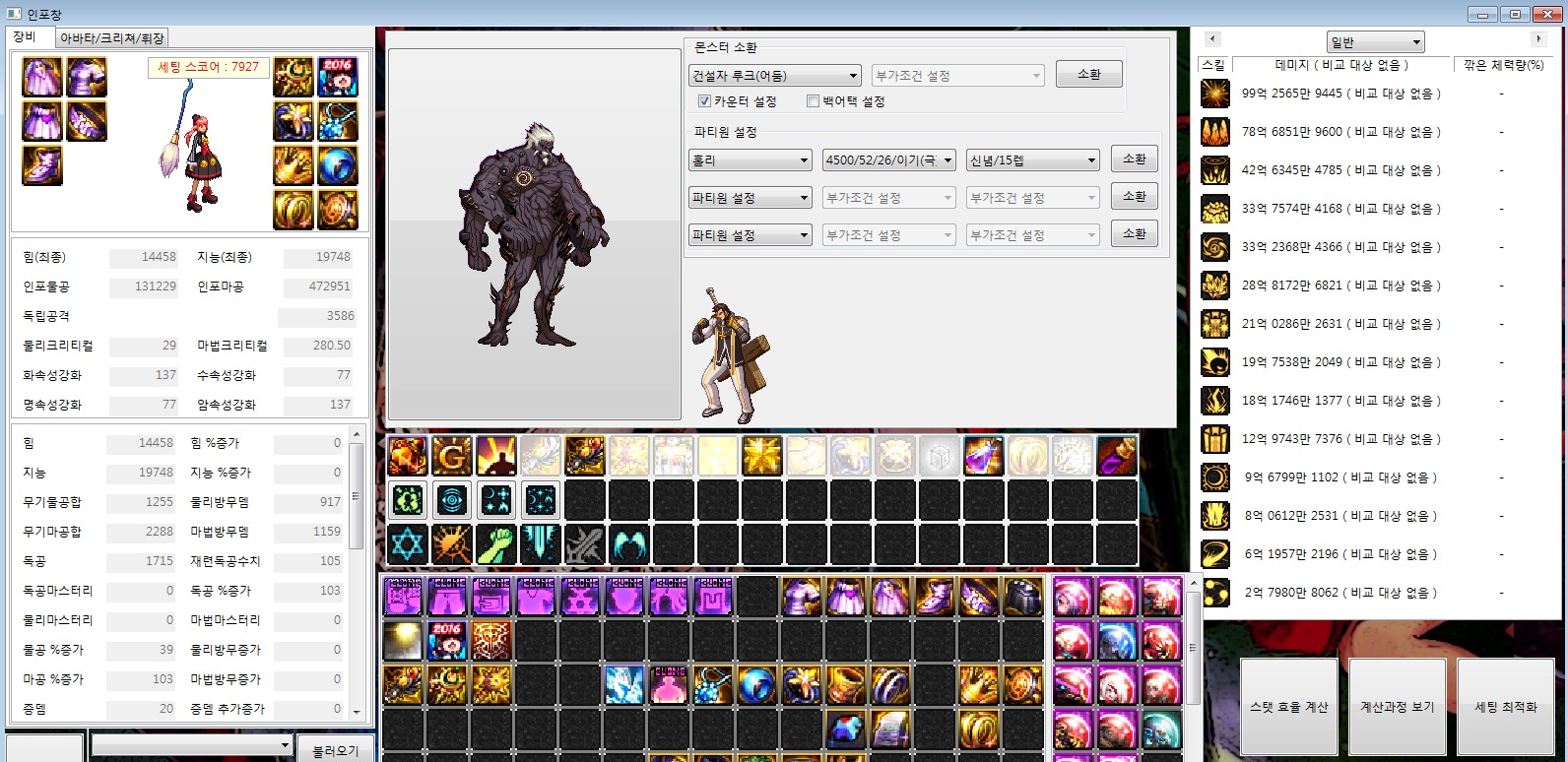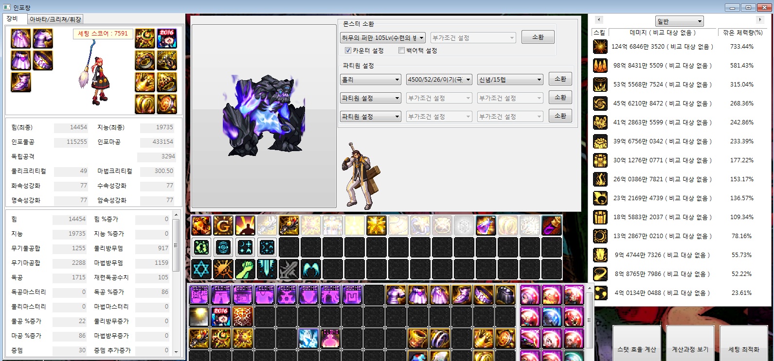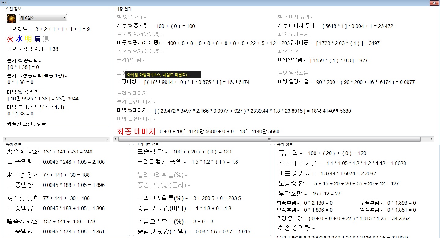 [엘레멘탈마스터] 수련방+계산기를 이용한 게슈, 핀드, 초대륙의 비교계산기 - 수련방을 최대한 맞춘상태의 게슈 핀드 초대륙 비교입니다. 게슈 핀드 초대륙은 전체 12증폭으로 계산하였습니다. 우선 정확한 표본을 위해 수련방과 계산기를 맞췄습니다. 오차는 노스위칭 1천 이내 스위칭 1억이내, 계산은 신뢰할만한 수준이라고 생각합니다. 전부 노버닝 입니다. 계산기의 스위칭은 실제 스위칭과는 다르게 실시간적용스킬인 1각같은경우에도 스위칭 적용데미지로 표기되니 2각만 비교하시는게 좋을거라고 생각됩니다. 1. 노스위칭 수련방딸치실 분이라면 게슈셋은 후회없는 선택이라고 생각됩니다. 4. 게슈 VS 핀드 VS 초대륙 (루크할배=방깎 12.5%적용) 근소한 차이로 게슈가 이기게 됩니다. 아래 스샷은 방깎 12.5%의 적용에 대한 내용입니다. 보스 방깎50%감소가 적용되어있습니다. 그래도 게슈셋이 근소한 차이로 이기게됩니다. 2각만 비교하여, 1인 기준으로는 게슈, 핀드, 초대륙의 데미지는 비슷하게 나오게됩니다. 하지만 홀리 버프를 받게될시, 그리고 그 홀리의 스펙이 올라갈수록 초대륙 > 핀드 > 게슈 순서 바뀌게 됩니다. 홀리의 스펙이 점점 더 올라가게 되면 핀드 > 초대륙 > 게슈의 순서로 바뀌게됩니다. 나중에는 핀드가 게슈보다 4억가까이 쌔집니다. 그러나 헤블론의 영광이 속추로 적용되면 게슈가 압도적으로 높아집니다. 5. 게슈 VS 핀드 VS 초대륙 (루크할배=방깎 12.5%적용, 엔드스펙 홀법적용) 6. 게슈 VS 핀드 VS 초대륙 (루크할배=방깎 12.5%적용, 엔드스펙 홀법적용, 헤블론 속추 적용) 게슈에 추뎀이 없다보니 이런결과가 나오는듯한데요 우선 이러한 상황입니다. 그래서 더 궁금하신 여러분들을 위하여 황홀 VS 무탐을 비교해보았습니다. 7. 황홀 VS 무탐 비교 황홀 VS 무탐 수련방에서의 퍼만입니다. 근소한 차이로 무탐이 앞섭니다. 9. 황홀 VS 무탐 비교 (보스 대상 비교) 근소한 차이로 황홀이 앞서갑니다. 참고로 홀법 적용시키면 황홀이 10억 정도 높게 나옵니다. 그리고 헤블론의 영광이 속추로 적용된상태라면 15억 넘게 차이가 납니다. 10. 황홀 VS 무탐 비교 (보스 대상 비교, 엔드스펙 홀법, 헤블론 속추 적용) 세줄 요약 1. 수련장딜딸 칠경우 게슈 > 핀드 > 초대륙 순서, 보스 대상시 게슈 > 핀드 > 초대륙(매우근소한 차이) 2. 홀법, 헤블론 스증뎀 적용시 핀드 > 초대륙 > 게슈, 속추 적용시 게슈 > 초대륙 > 핀드 3. 황홀 무탐 비교 시 1인 퍼만 기준 무탐 > 황홀, 홀법 적용시 황홀 > 무탐, 헤블론 속추 적용시 황홀>>>>>>>>>무탐 이상입니다. |