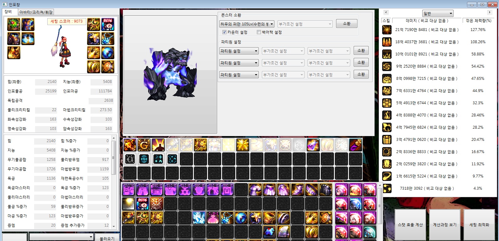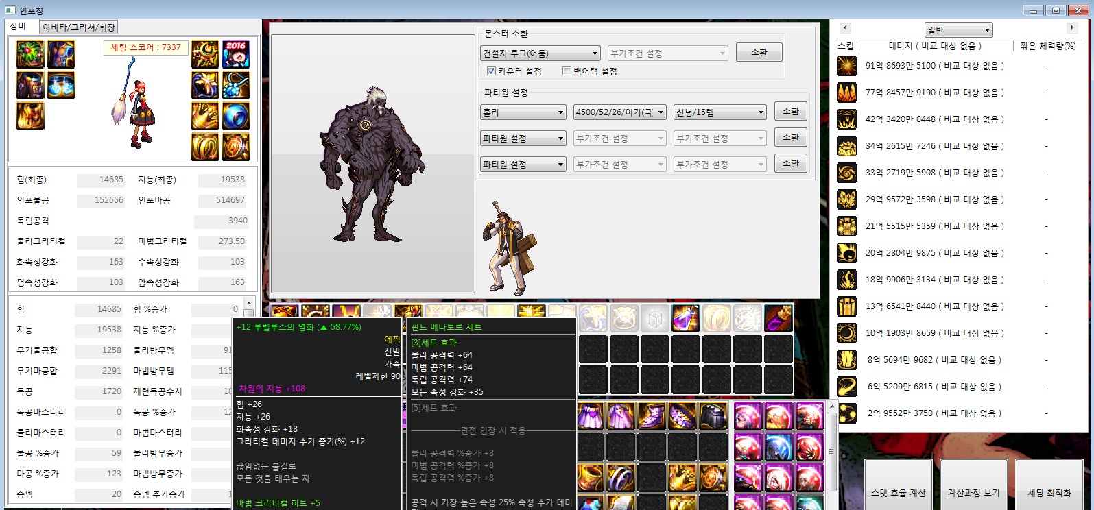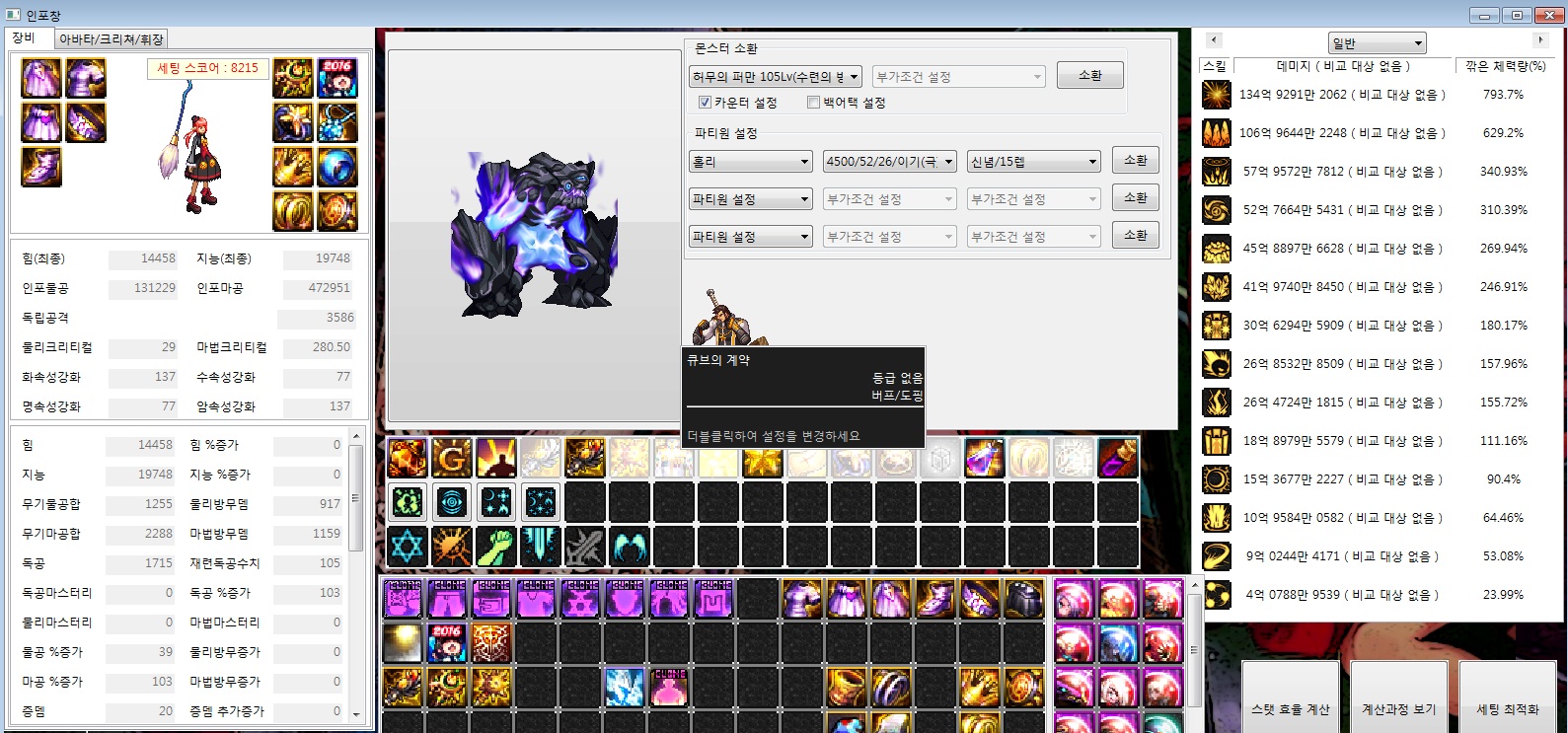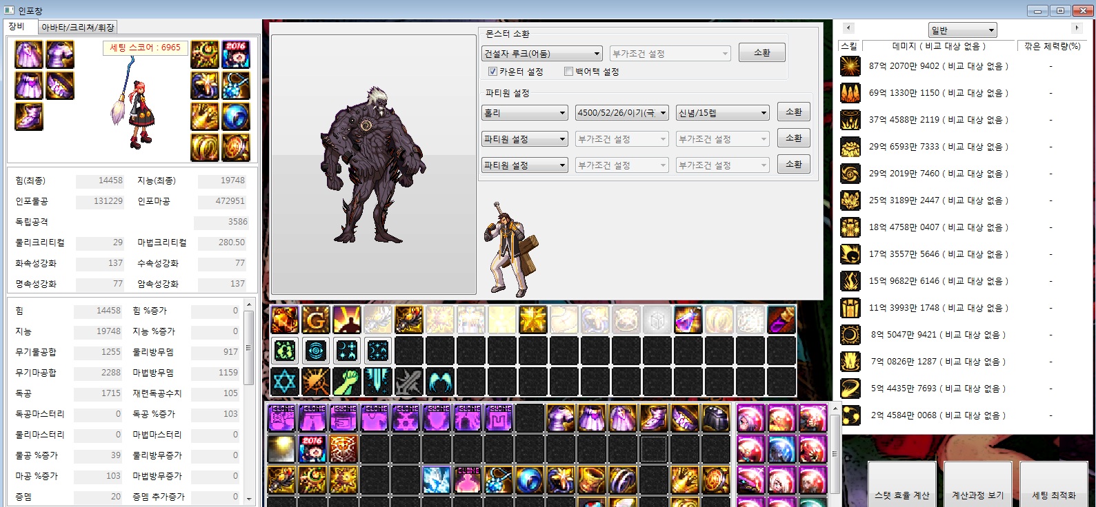 [엘레멘탈마스터] 수련방+계산기를 이용한 게슈, 핀드, 초대륙의 비교계산기 - 수련방을 최대한 맞춘상태의 게슈 핀드 초대륙 비교입니다. 게슈 핀드 초대륙은 전체 12증폭으로 계산하였습니다. 우선 정확한 표본을 위해 수련방과 계산기를 맞췄습니다. 오차는 노스위칭 1천 이내 스위칭 1억이내, 계산은 신뢰할만한 수준이라고 생각합니다. 전부 노버닝 입니다. 계산기의 스위칭은 실제 스위칭과는 다르게 실시간적용스킬인 1각같은경우에도 스위칭 적용데미지로 표기되니 2각만 비교하시는게 좋을거라고 생각됩니다. 1. 노스위칭 수련방딸치실 분이라면 게슈셋은 후회없는 선택이라고 생각됩니다. 4. 게슈 VS 핀드 VS 초대륙 (루크할배=방깎 12.5%적용) 근소한 차이로 게슈가 이기게 됩니다. 아래 스샷은 방깎 12.5%의 적용에 대한 내용입니다. 보스 방깎50%감소가 적용되어있습니다. 그래도 게슈셋이 근소한 차이로 이기게됩니다. 2각만 비교하여, 1인 기준으로는 게슈, 핀드, 초대륙의 데미지는 비슷하게 나오게됩니다. 하지만 홀리 버프를 받게될시, 그리고 그 홀리의 스펙이 올라갈수록 초대륙 > 핀드 > 게슈 순서 바뀌게 됩니다. 홀리의 스펙이 점점 더 올라가게 되면 핀드 > 초대륙 > 게슈의 순서로 바뀌게됩니다. 나중에는 핀드가 게슈보다 4억가까이 쌔집니다. 그러나 헤블론의 영광이 속추로 적용되면 게슈가 압도적으로 높아집니다. 5. 게슈 VS 핀드 VS 초대륙 (루크할배=방깎 12.5%적용, 엔드스펙 홀법적용) 6. 게슈 VS 핀드 VS 초대륙 (루크할배=방깎 12.5%적용, 엔드스펙 홀법적용, 헤블론 속추 적용) 게슈에 추뎀이 없다보니 이런결과가 나오는듯한데요 우선 이러한 상황입니다. 그래서 더 궁금하신 여러분들을 위하여 황홀 VS 무탐을 비교해보았습니다. 7. 황홀 VS 무탐 비교 황홀 VS 무탐 수련방에서의 퍼만입니다. 근소한 차이로 무탐이 앞섭니다. 9. 황홀 VS 무탐 비교 (보스 대상 비교) 근소한 차이로 황홀이 앞서갑니다. 참고로 홀법 적용시키면 황홀이 10억 정도 높게 나옵니다. 그리고 헤블론의 영광이 속추로 적용된상태라면 15억 넘게 차이가 납니다. 10. 황홀 VS 무탐 비교 (보스 대상 비교, 엔드스펙 홀법, 헤블론 속추 적용) 세줄 요약 1. 수련장딜딸 칠경우 게슈 > 핀드 > 초대륙 순서, 보스 대상시 게슈 > 핀드 > 초대륙(매우근소한 차이) 2. 홀법, 헤블론 스증뎀 적용시 핀드 > 초대륙 > 게슈, 속추 적용시 게슈 > 초대륙 > 핀드 3. 황홀 무탐 비교 시 1인 퍼만 기준 무탐 > 황홀, 홀법 적용시 황홀 > 무탐, 헤블론 속추 적용시 황홀>>>>>>>>>무탐 이상입니다. |