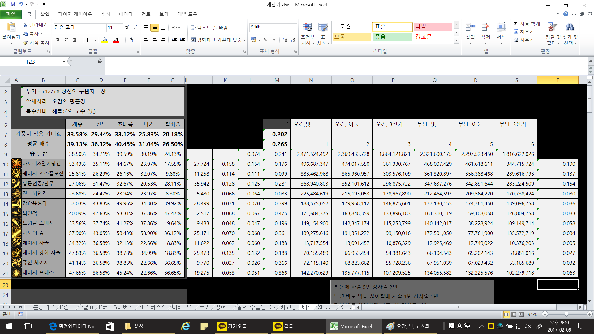 [배틀메이지] (제작픽 분석 관련)여러분들의 의견을 듣고 싶습니다.지금 계산기도 어느정도 안정화 되고 해서 다시한번 제작픽만 따로 정밀분석을 할려고 합니다. 현재 '가중치 적용 기대값'은 딜 한싸이클 (퀘이사 -일당강트황 - 뇌연격막타 - 진뇌연격막타 - 퓨체 - 사춤 - 체프)을 돌릴때 얼마나 저 딜싸이클이 오르는지 계산하는 부분입니다. 그에 관련해서 사출/강사출의 딜지분을 어떻게 잡아야 하는지, 그러니깐 사출을 몇번이나 할수 있는지 여러분들의 의견을 묻고 싶습니다. 현재는 황룡에 사출 5번 강사출 2번 뇌연 바로 막타 끊어치면서 사출 1번 강사출 1번 진뇌 바로 막타 끊어치면서 사출 2번 강사출 1번 사춤에 사출 6번 강사출 2번 이렇게 잡혀있는데 이 횟수가 사실상 추뎀이 없으면 불가능에 가깝기 때문에 추뎀갯수에 따라 사출횟수를 조정할려고 하는데 저 이론상의 횟수가 가능한 추뎀은 몇추뎀 부터일꺼라고 생각되시나요. 일단 전 추뎀 3개. (핀드-초대륙/무탐형, 물풍선, 루크 빛옵) |