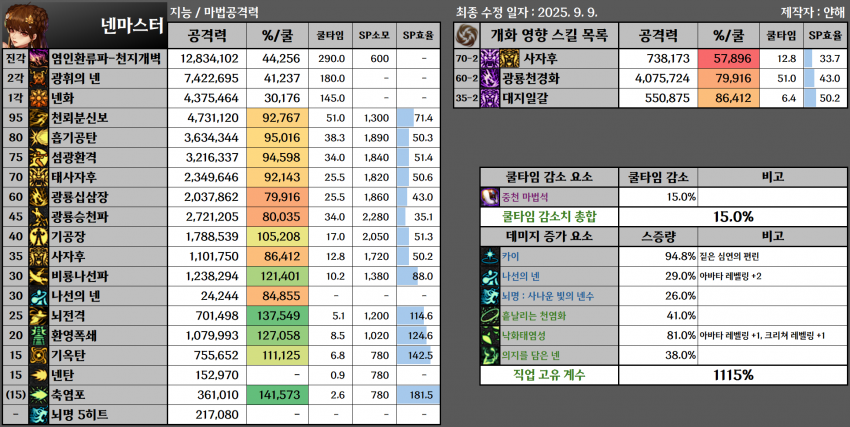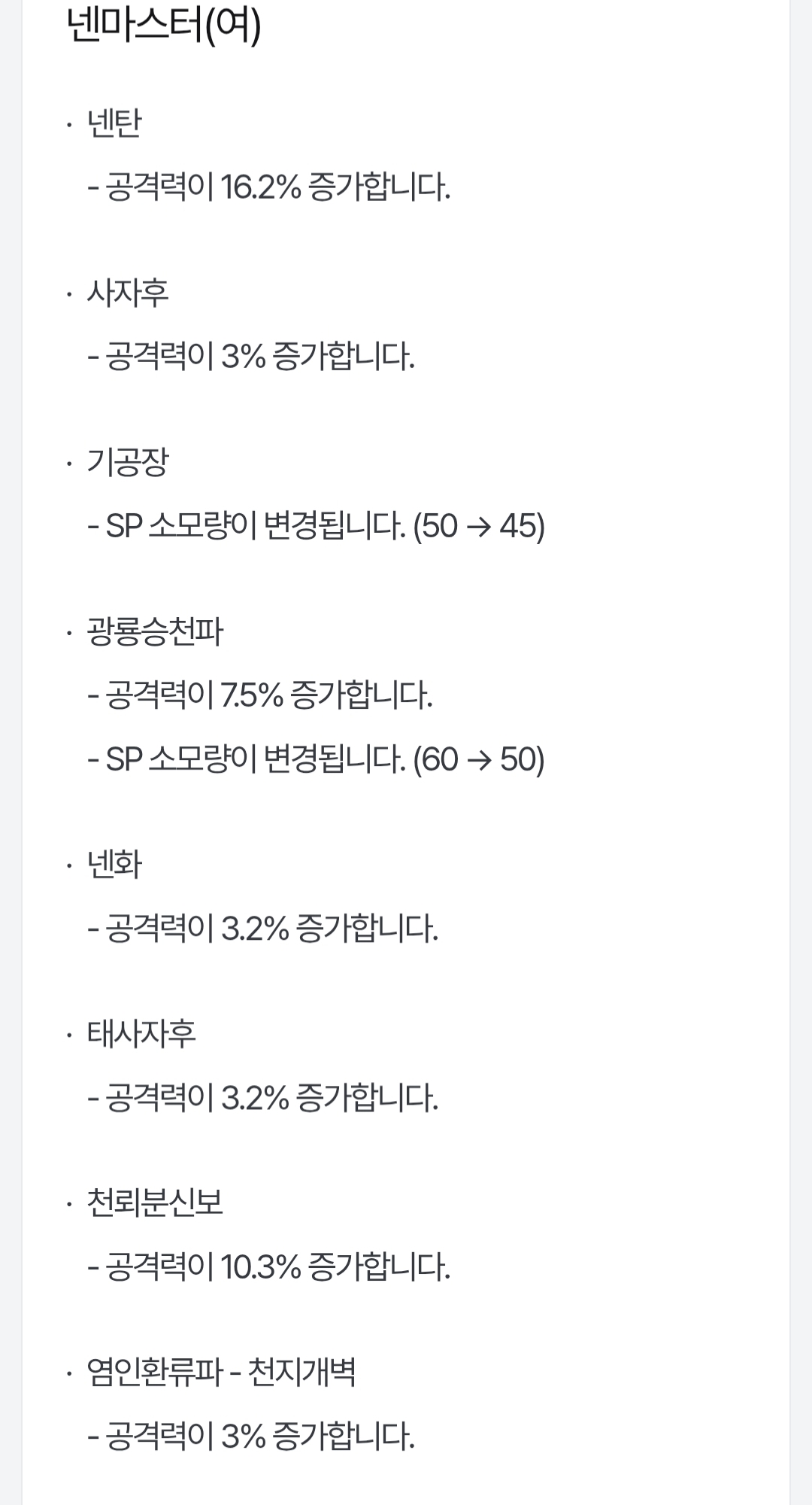 사자후 계수가 낮으나 원버튼 전방위 딜판정이라 어느정도 납득은 됨. 기공장 기존에도 퍼쿨은 준수하니 납득은 함. 45제는 고렙기이상으로 스포를 먹으면서, 7.5퍼상향먹어도 계수 290만에 75제와 동등한 쿨타임을 가졌는데, 20퍼에 가까운 수치를 받았어야 비슷해지는데, 이 수치면 이전과 그리 달라질건 없어보임.