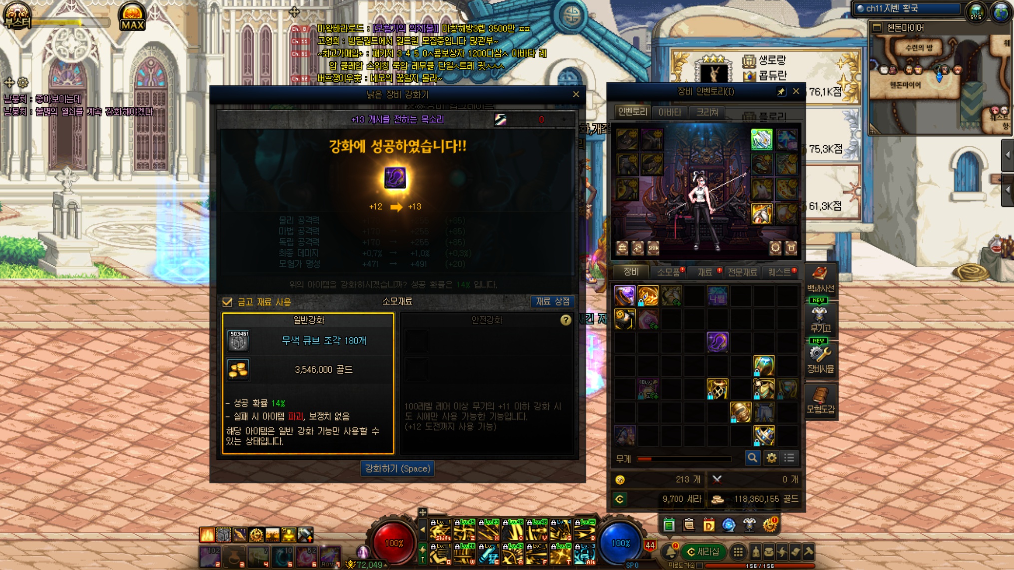 대 황 근 격 님의 조언으로 강화 던지니 13강성공하고 아쉽(?)게도 핌 귀걸이는 터져버려서 바로 핌에게 12증 초월해줌 |
