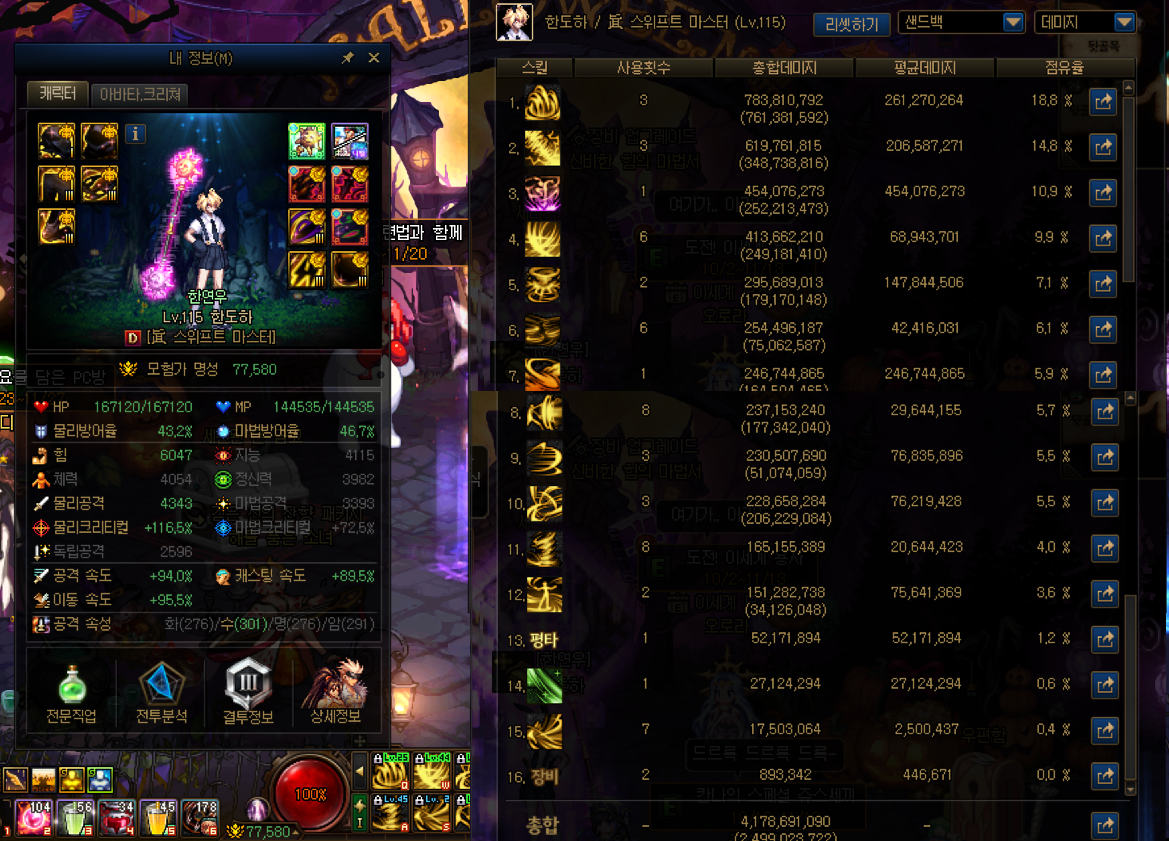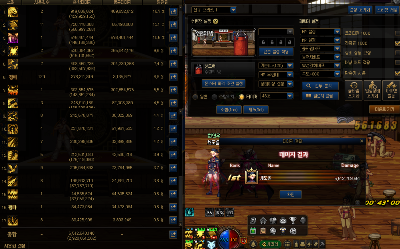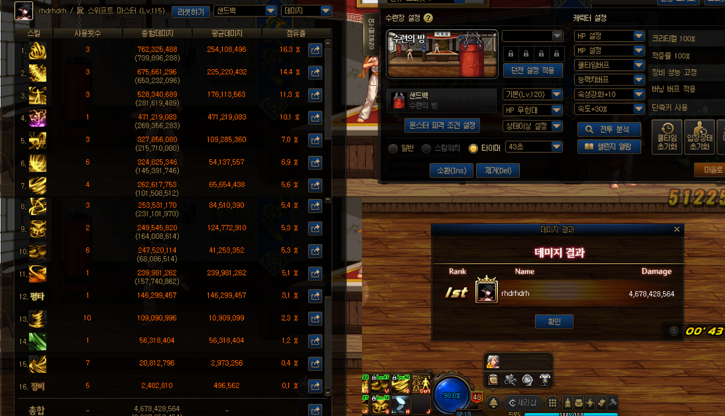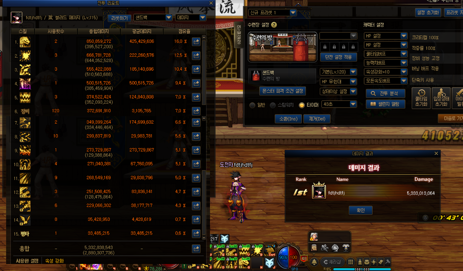 본섭 아올 (까먹고 힘비 속강 안먹음) 힘비+속강물약 계산시 43.58억 던담기준 43.3억