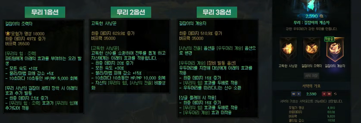 무리 2번 옵션을 보면 깡딜이 629.9%에 추가로 또 20프로 증뎀이 또있음 무리3번은 싱글기준 510.9%에 깡스증이 16프로