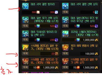 퍼섭 마법서 들여다 보면 화살표로 표시된 3줄이 새로 추가됬는데 아래 두 줄은 재료 남은 복귀자가 새로 키울때 쓸만할 것 같다 레전장비,일반무기 쪽은 선택상자, 승급서는 레전무기를 서사시 업글이다.